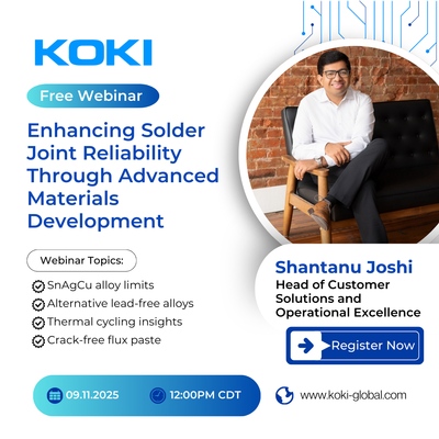 KOKI, a global leader in advanced soldering materials and process optimization services, is pleased to announce an upcoming webinar: Enhancing Solder Joint Reliability Through Advanced Materials Development. The event will take place on Thursday, September 11, 2025, at 12:00 PM CDT.