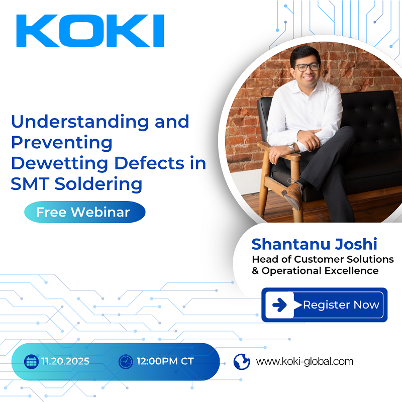 The session will be presented by Shantanu Joshi, Head of Customer Solutions and Operational Excellence at Koki Solder America, on Thursday, November 20, 2025, at 1:00 PM ET.