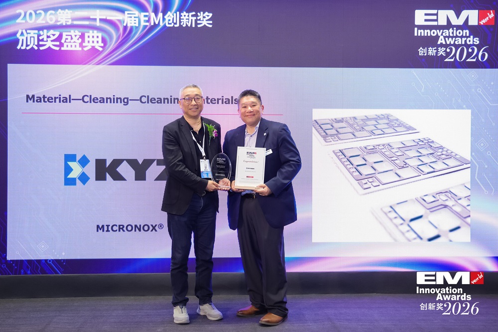 KYZEN, the global leader in innovative environmentally responsible cleaning chemistries, proud to announce that it has received a 2026 EM Innovation Award in the Cleaning Materials category for its MICRONOX® MX2123 cleaning chemistry. The award was presented on March 26, 2026, during the EM Innovation Awards Ceremony held in conjunction with productronica China 2026 at the Shanghai New International Expo Center.