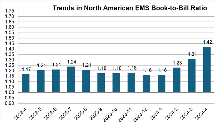 IPC announced today the April 2024 findings from its North American Electronics Manufacturing Services (EMS) Statistical Program. The book-to-bill ratio stands at 1.42.